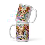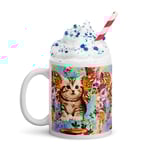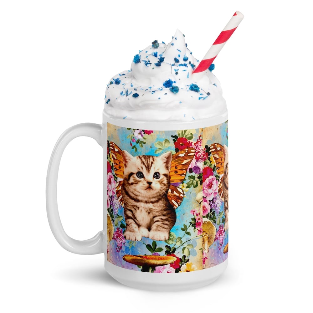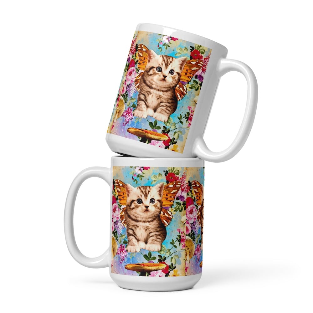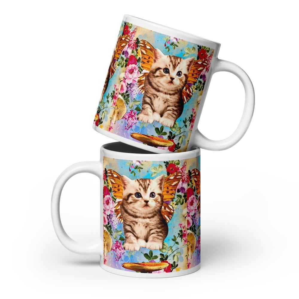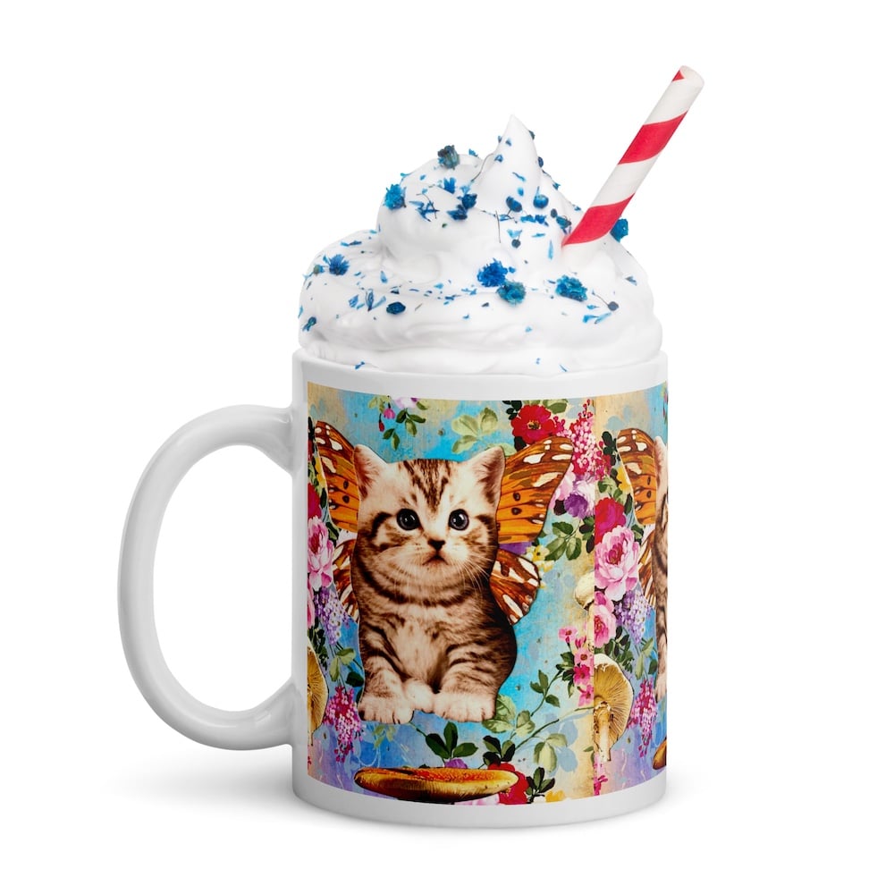Looking for a fun addition to your caffeinated mornings? This ceramic mug featuring my original collage "Butterfly Mushroom Kitty" printed all around it - is sure to put a smile on your face! It’s dishwasher-safe and microwave safe too!