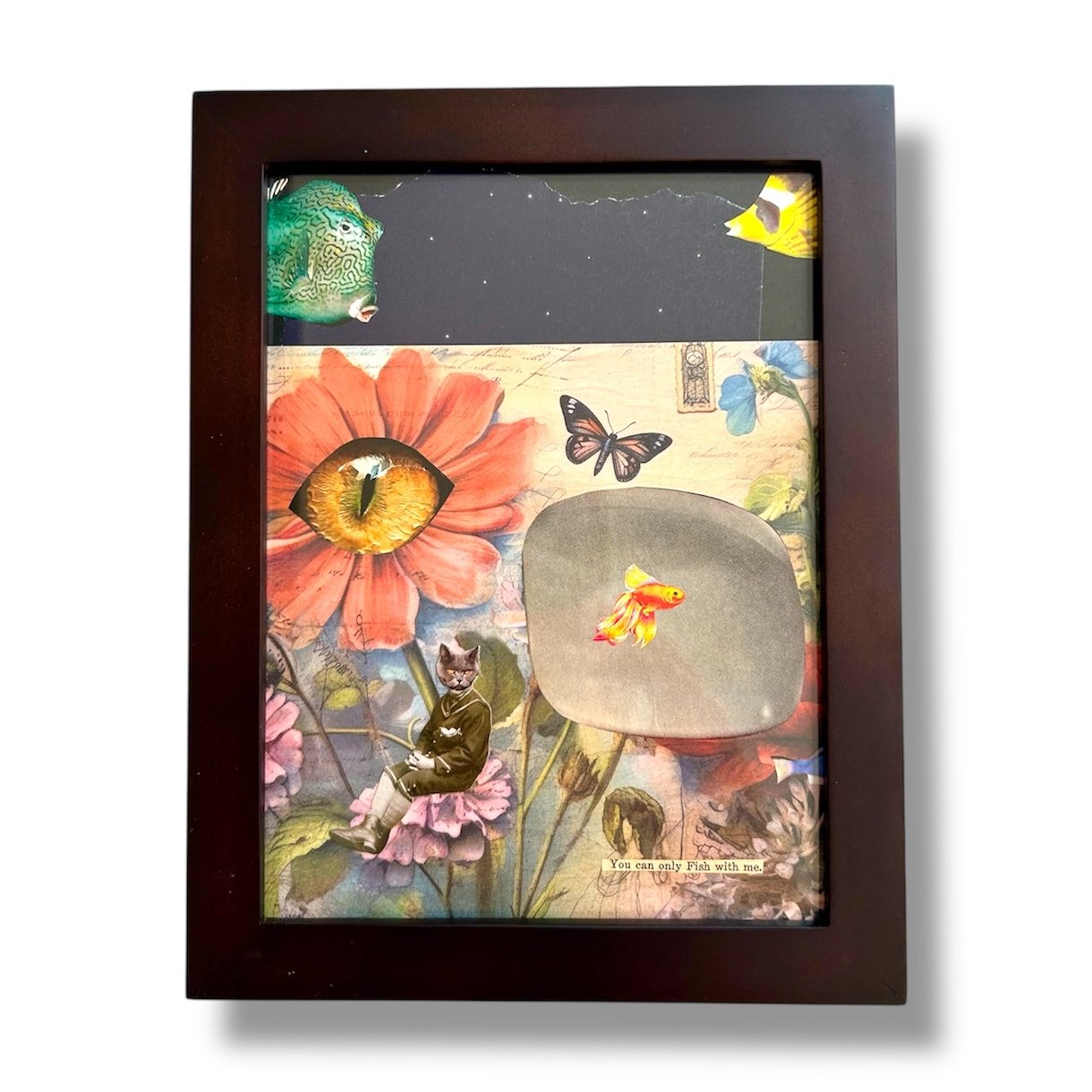 Catfishing for a TV Dinner - Cat Collage - Anthropomorphism - Cat Fish - Original Art - Framed