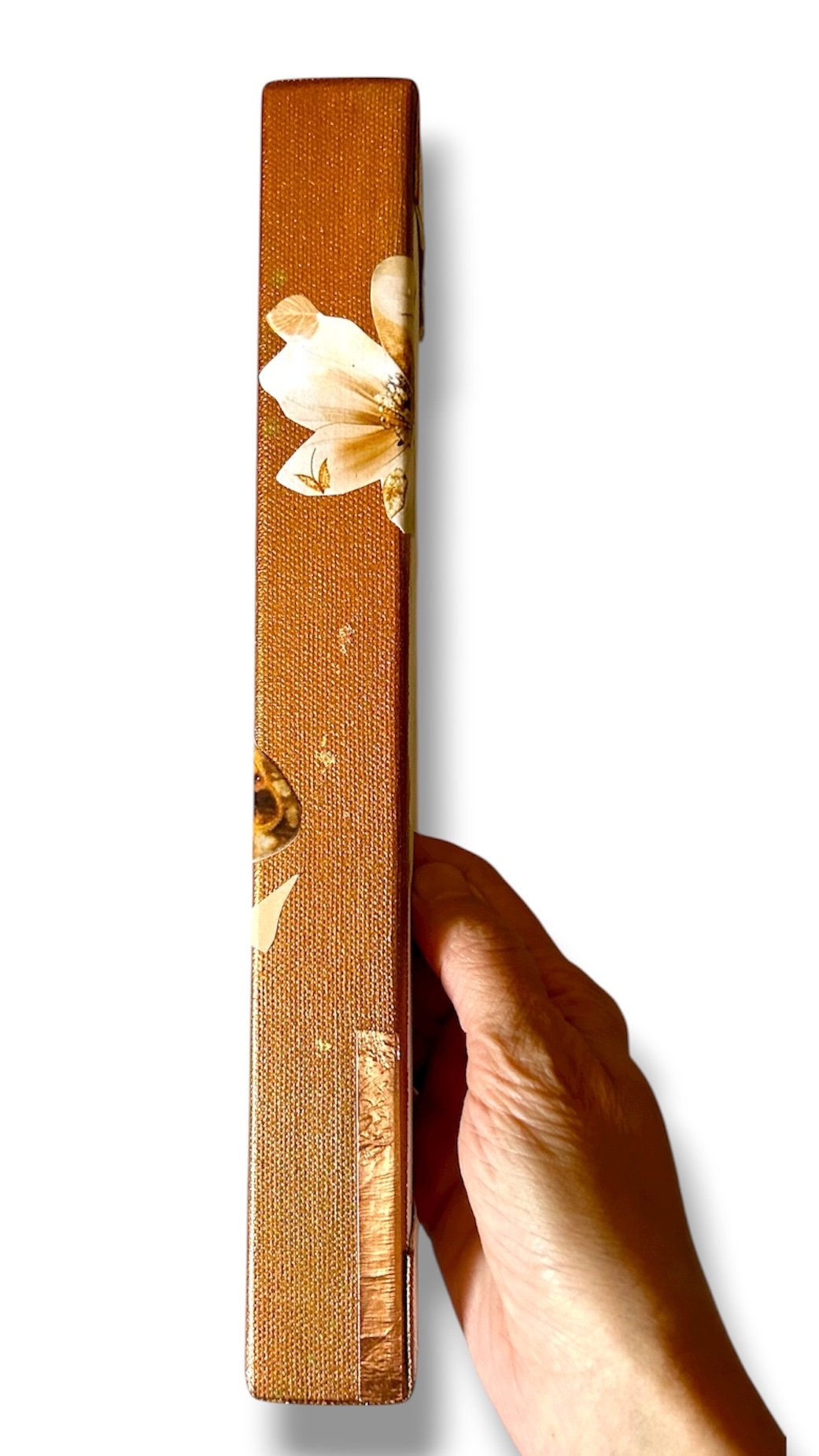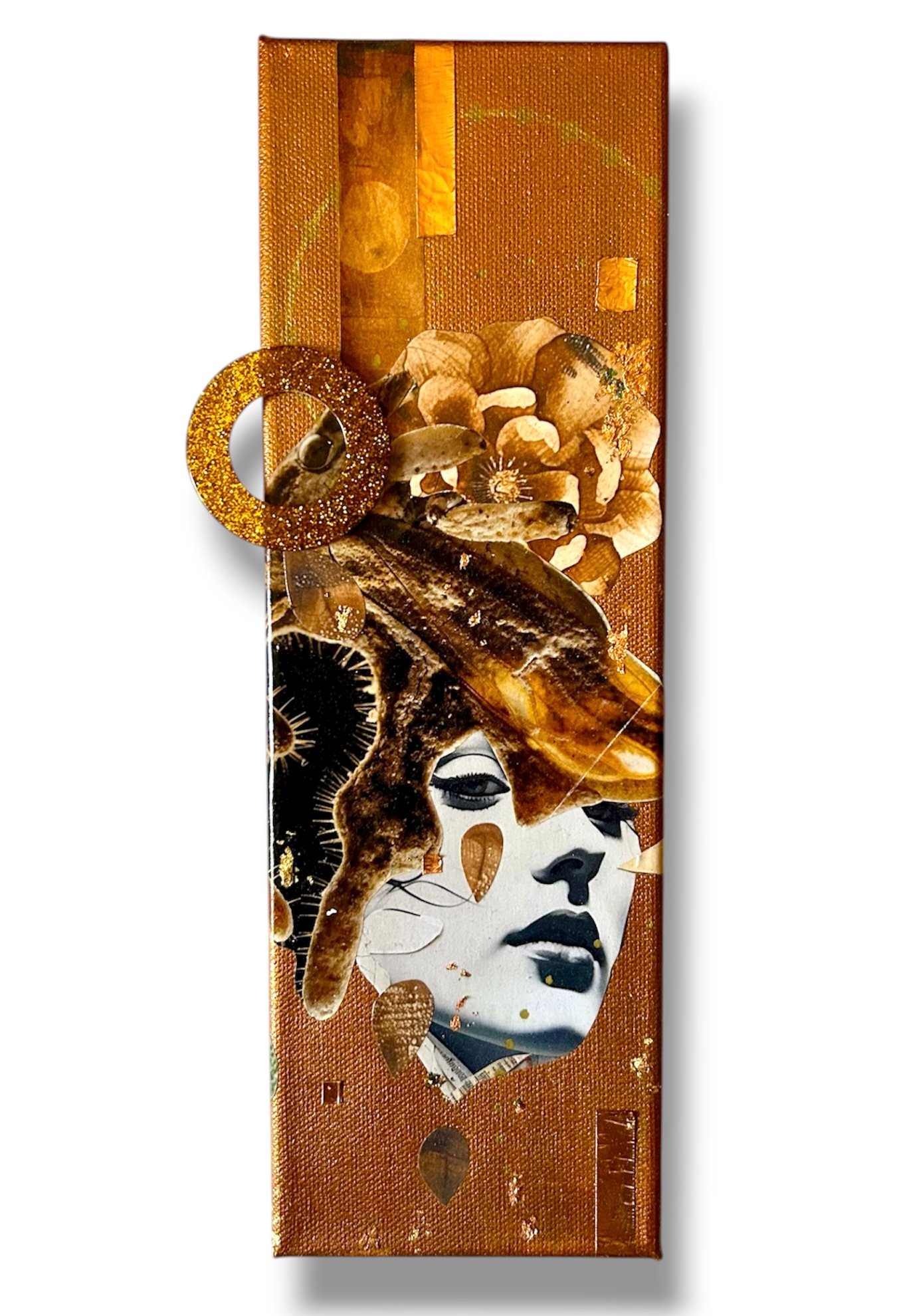 This piece has TONS of copper and gold hues as well as that surreal enigmatic vibe I LOVE to create. The collage wraps around the edges of the 1 1/4" thick canvas edge.