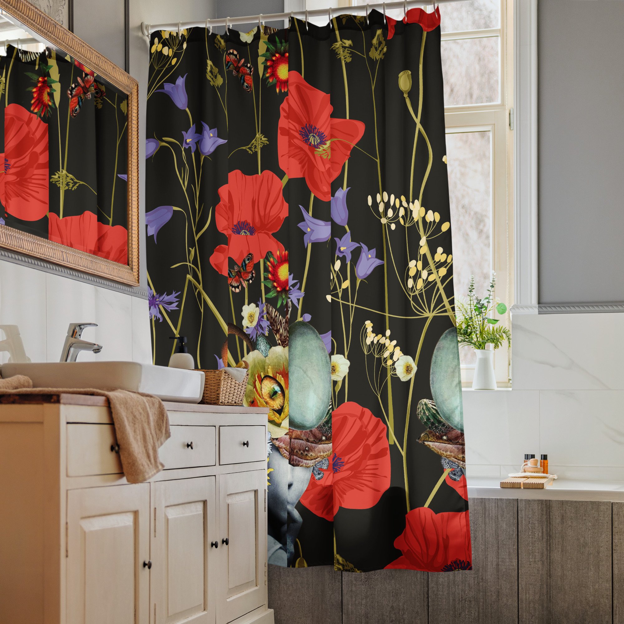 LadyJennDecorate your home and upgrade your bathroom with an original LadyJennD "Personification of EGGcellece" shower curtain! Featuring my original aforementioned collage artwork superimposed on a gorgeous background of poppies! Poppies are one of my favorite flowers! They are so resilient and symbolic of life and death and dreams!