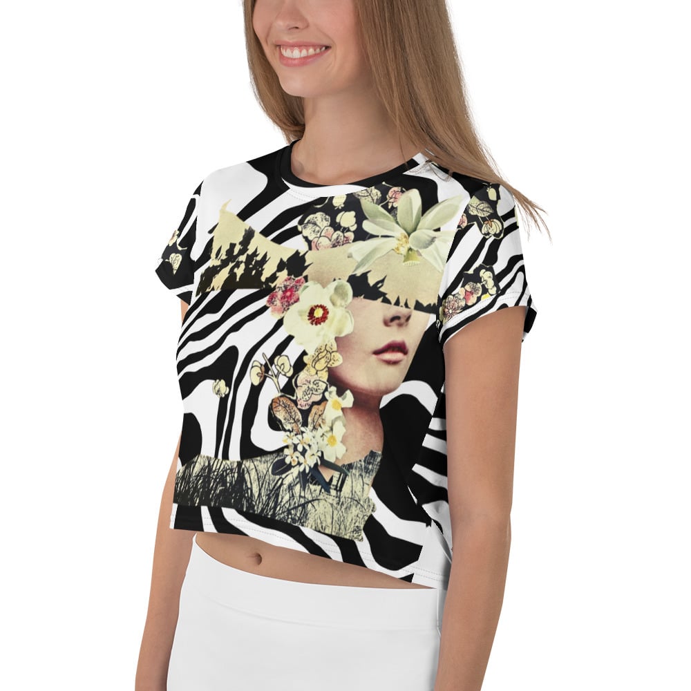 This stylish and versatile all over print crop top features my original collage artwork "Fragments" superimposed over a funky black and white pattern.