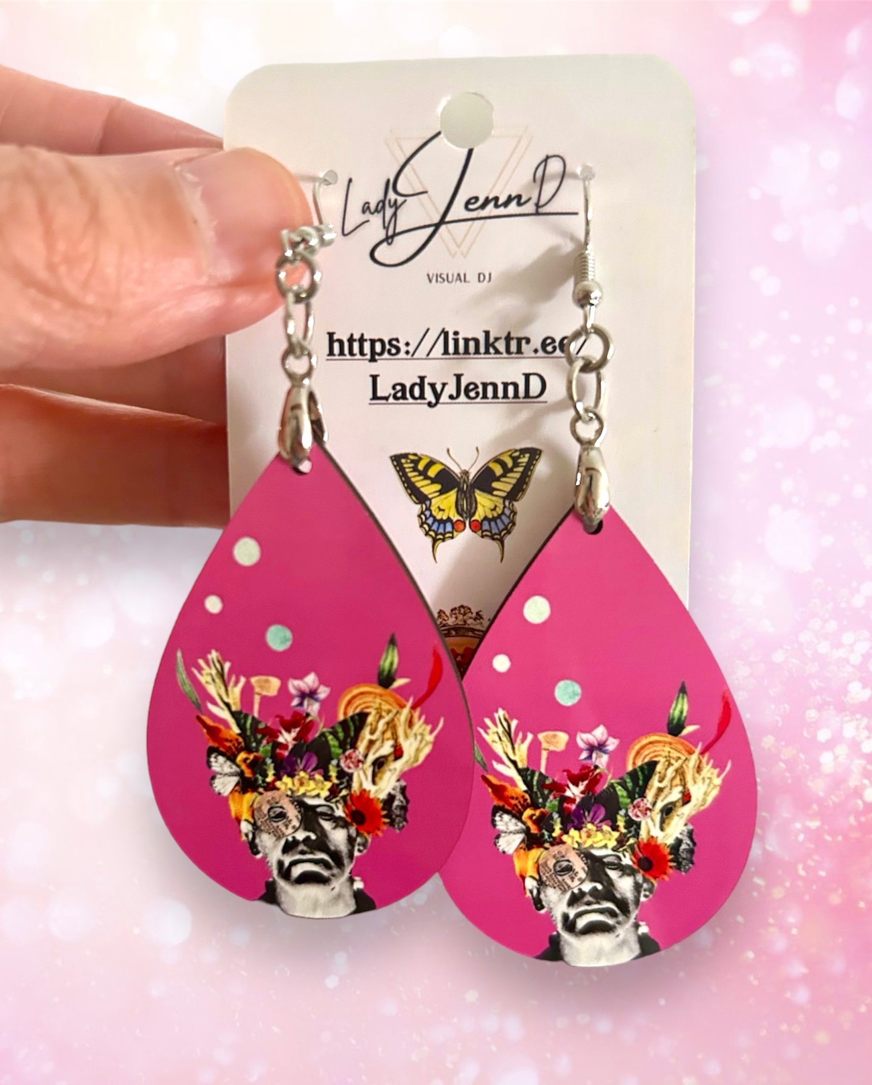 These colorful earrings feature my original botanical collage titled "Frankenflower" - sublimation printed ON BOTH SIDES of the super lightweight wood material earrings! They are shiny/glossy to boot! Surgical steel for pierced ears, and they will go with ANY outfit! Your earrings will be professionally packaged and sent USPS mail with tracking number and insurance.