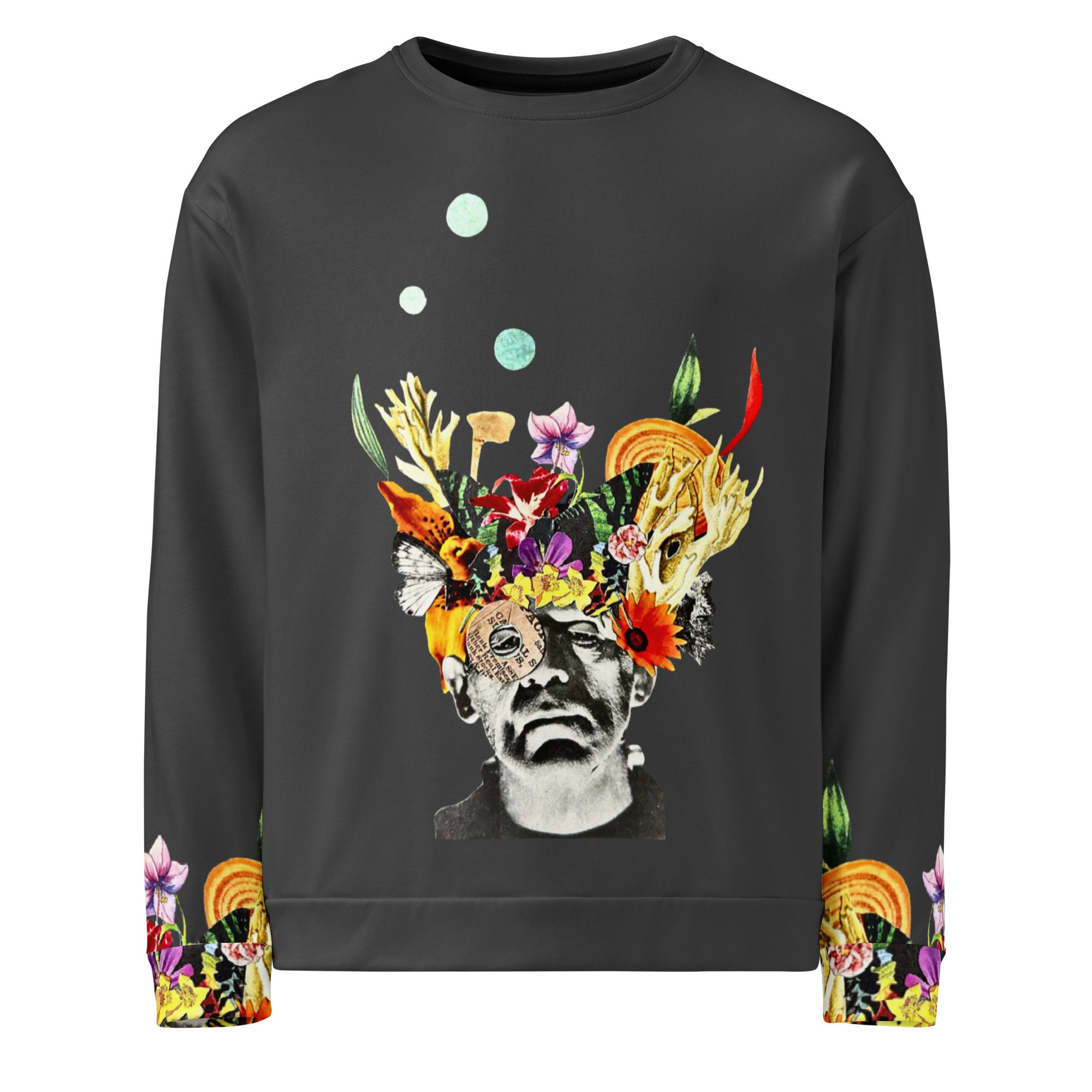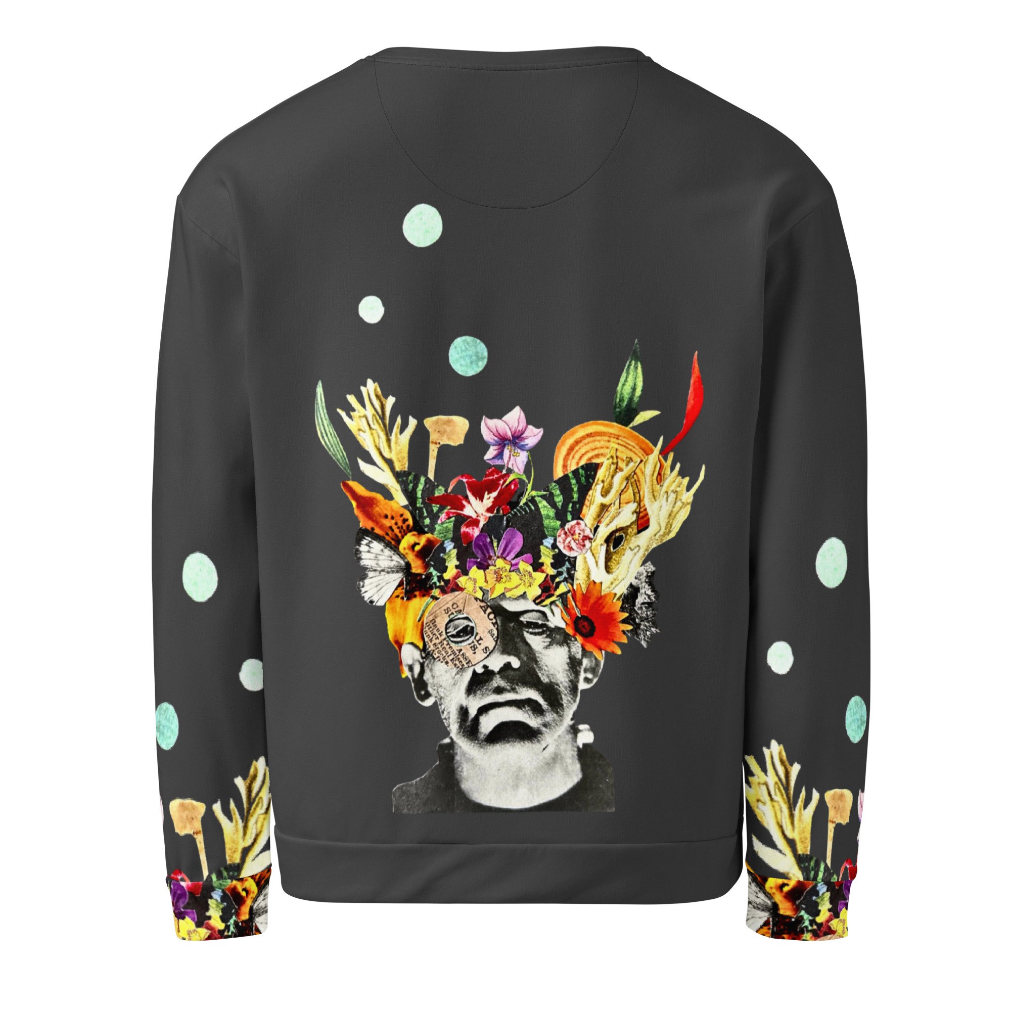 This unique and comfy pullover sweatshirt features my original collage "Frankenflower" printed on the front, back, and parts on the sleeves (which is my FAVE part of this garment!)
