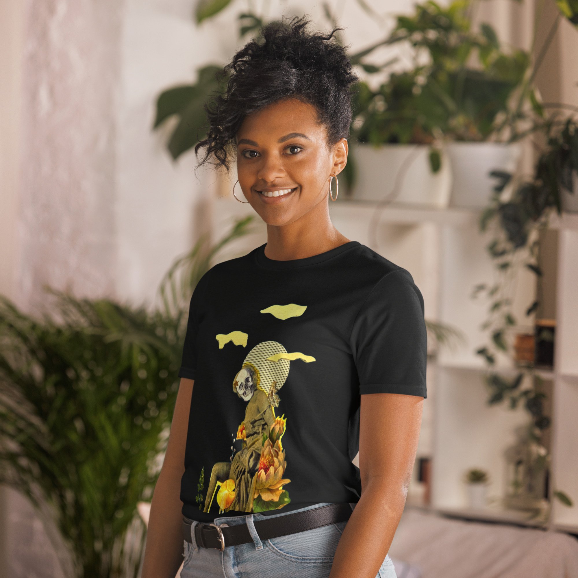 You've now found the staple t-shirt of your wardrobe. It's made of 100% ring-spun cotton and is so very soft and comfy. The double stitching on the neckline and sleeves add more durability to what is sure to be a favorite! This limited edition cotton tee features a print of my original collage artwork "Hello October!" Perfect on its own, tucked in or not, with a blazer, cardigan, etc, the soft artful tee is super versatile too!
