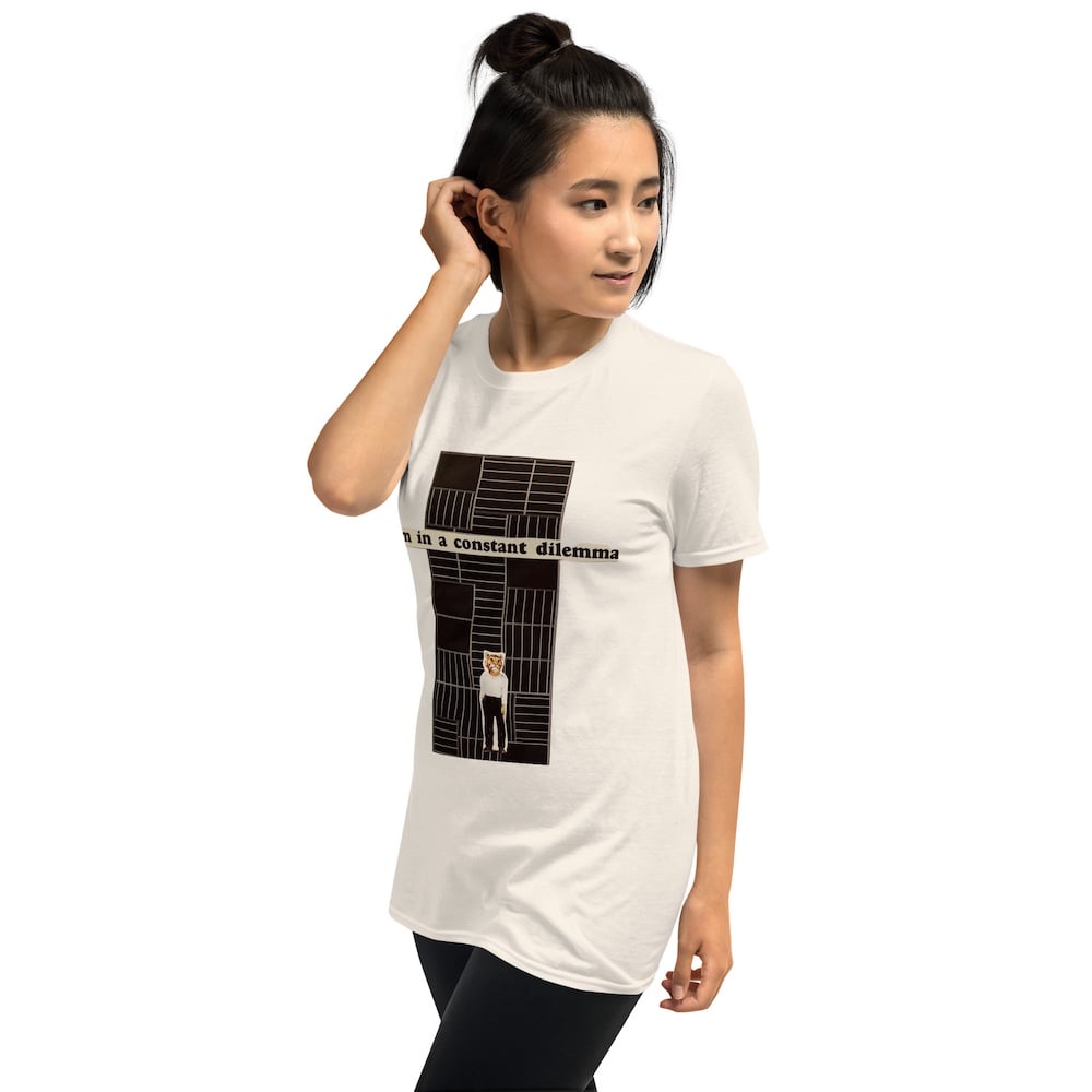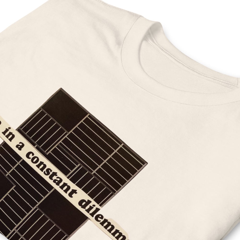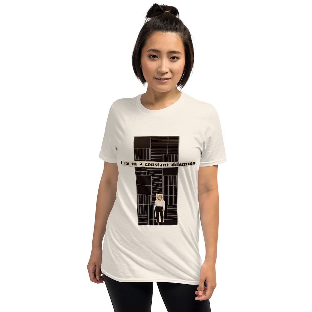 This classic crewneck 100% ring spun cotton t-shirt features my original collage "I am in a Constant Dilemma" printed on the front of the "natural" color (off white) garment.