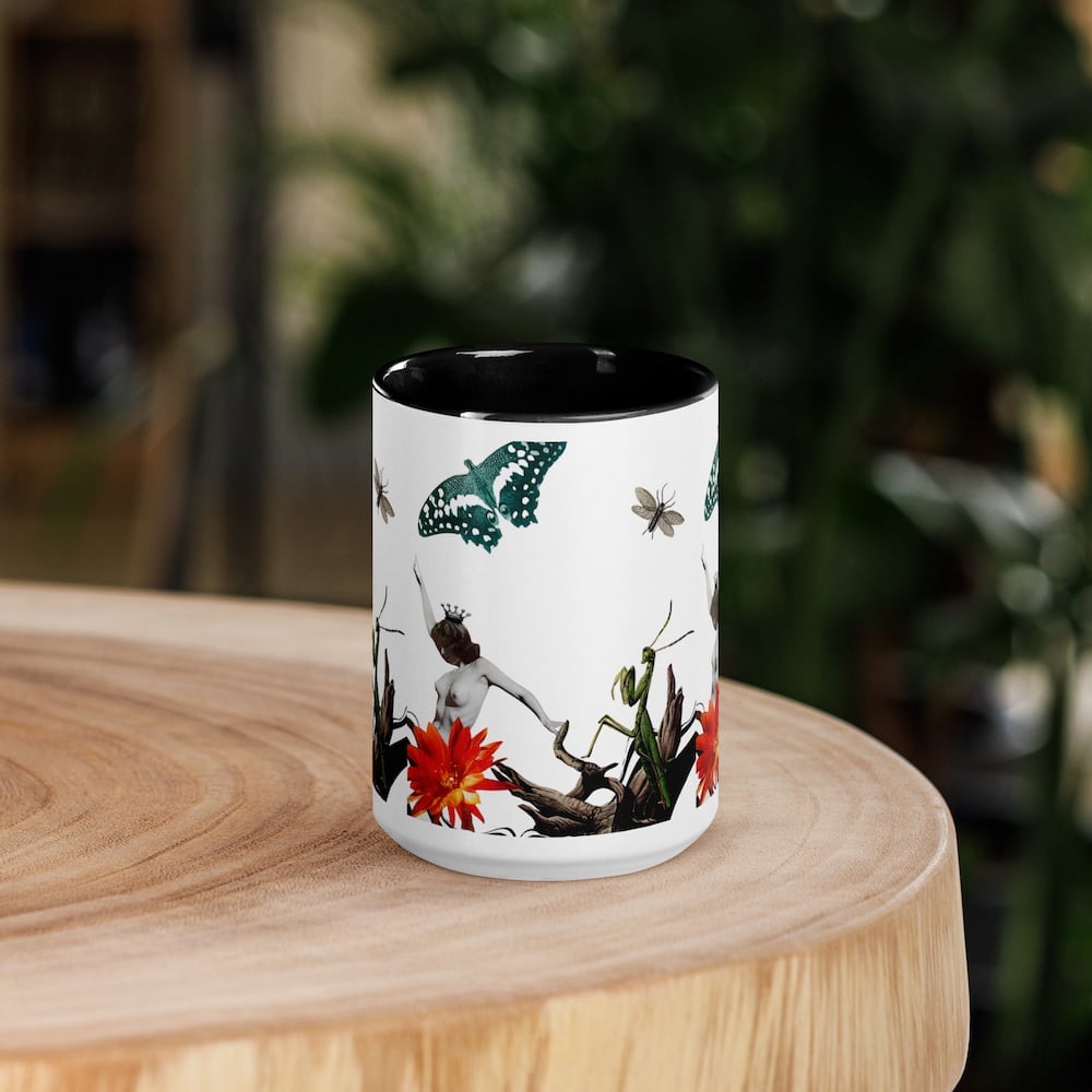 Add a splash of artful inspiration to your coffee or tea ritual! This durable ceramic mug not only has my gorgeous and enigmatic "Mantis Queen" collage designed on it, but also a bold and black rim, handle, and inside, so the mug is bound to spice up your mug rack.