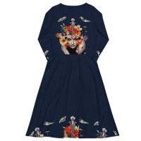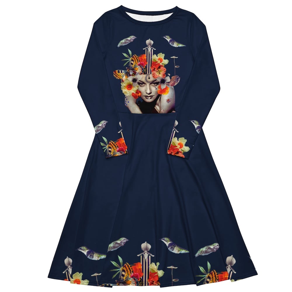 This beauty is in navy blue and features my original collage artwork: "She Follows the Rhythm of the Moon" printed all over the dress!