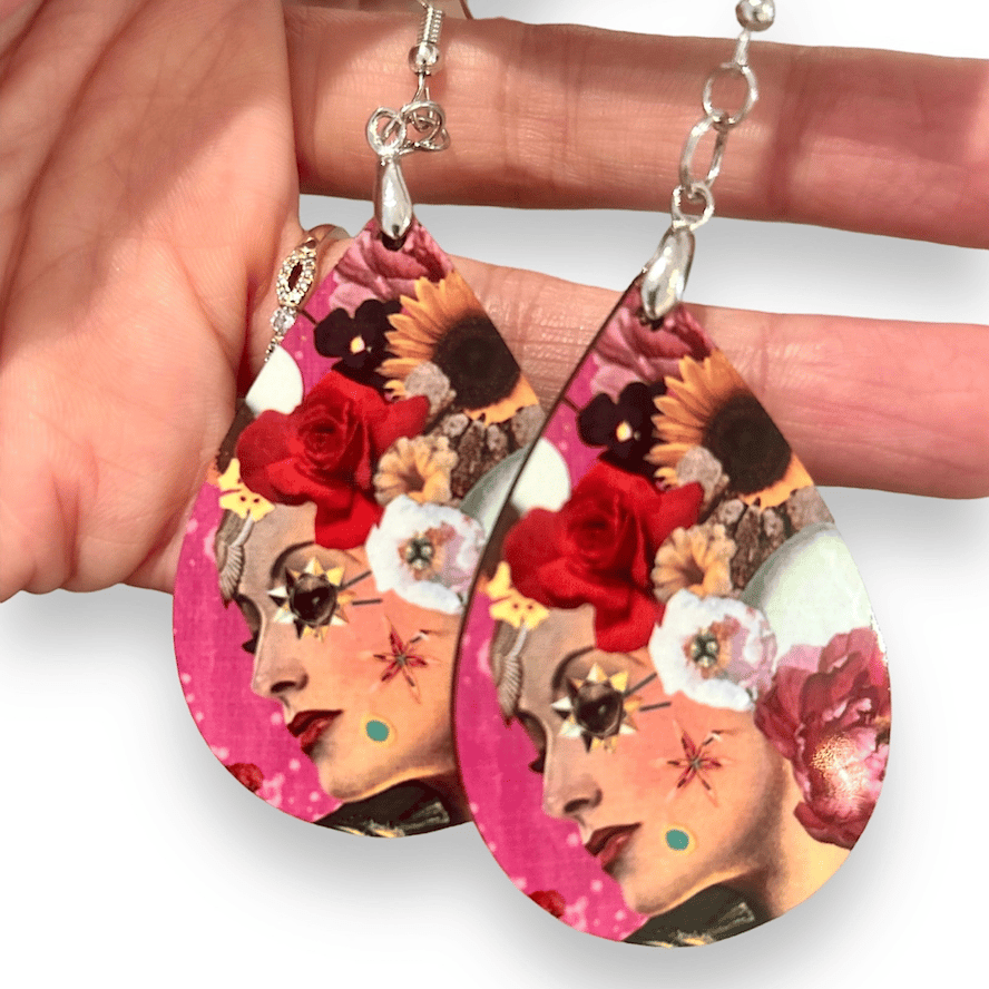 These bold, botanical earrings feature my original collage titled "She Doesn't Let Life Drag Her Down" - sublimation printed ON BOTH SIDES of the super lightweight wood material earrings! They are shiny/glossy to boot! Surgical steel for pierced ears, and they do go with ANY outfit! Your earrings will be professionally packaged and sent USPS mail with tracking number and insurance within 7 days of ordering.