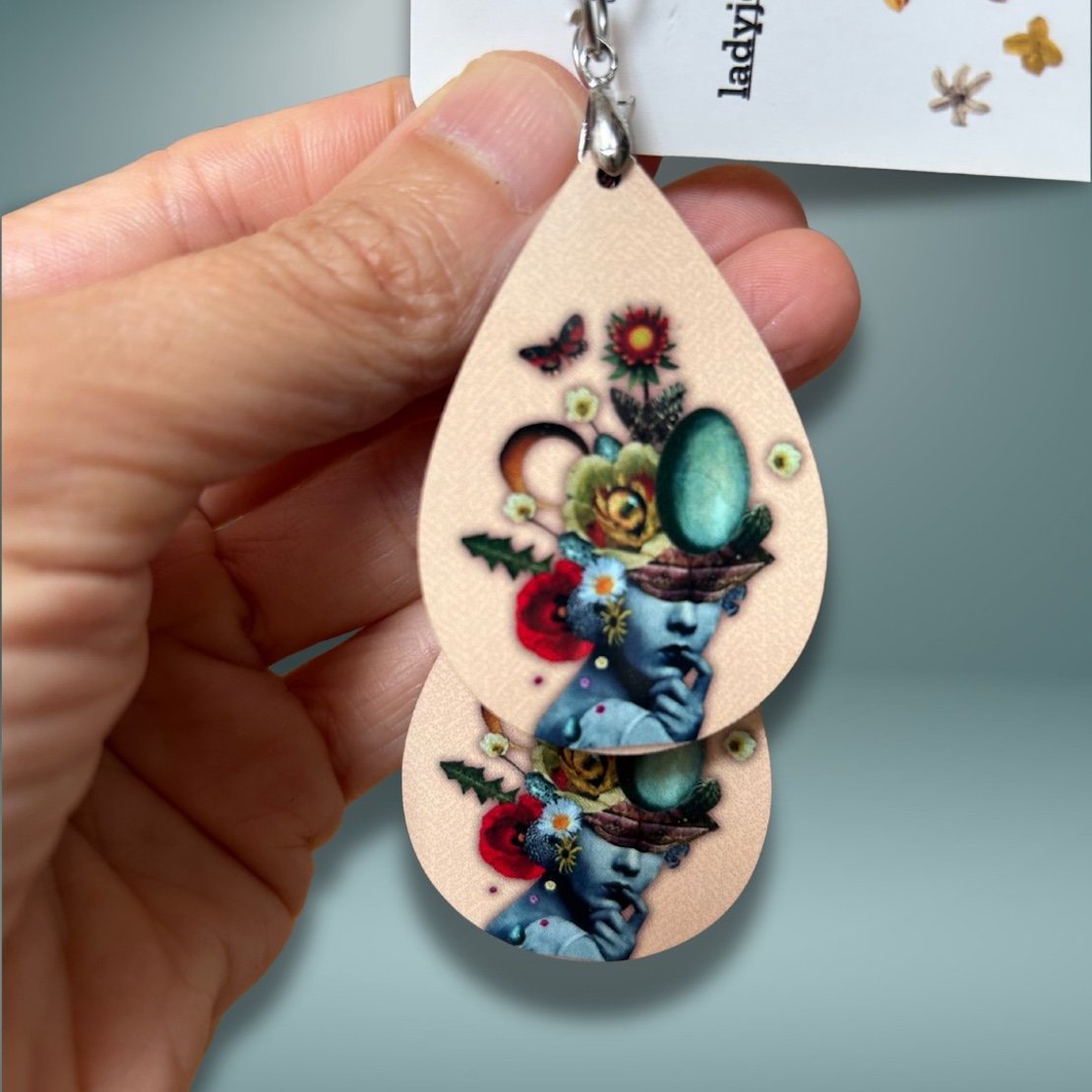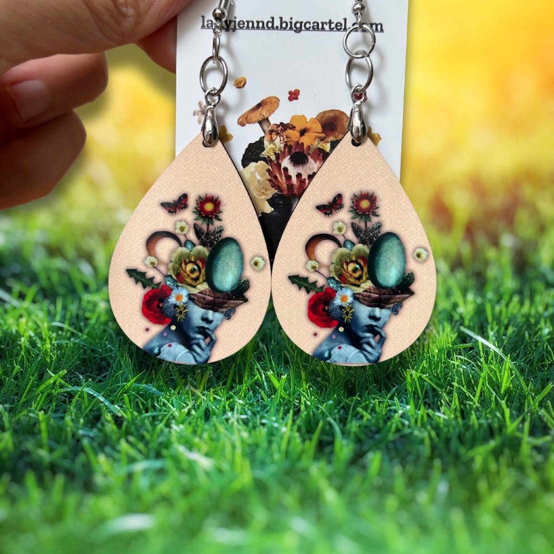 These beautiful bold yet neutral earrings feature my original botanical collage titled "The Personificationm of EGGcellence" - printed ON BOTH SIDES of the super lightweight wood material earrings. They are shiny/glossy to boot! Surgical steel for pierced ears, and they will surely go with ANY outfit! Your earrings will be professionally packaged and sent USPS mail with tracking number and insurance.