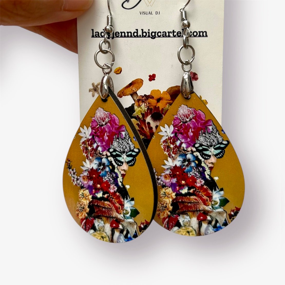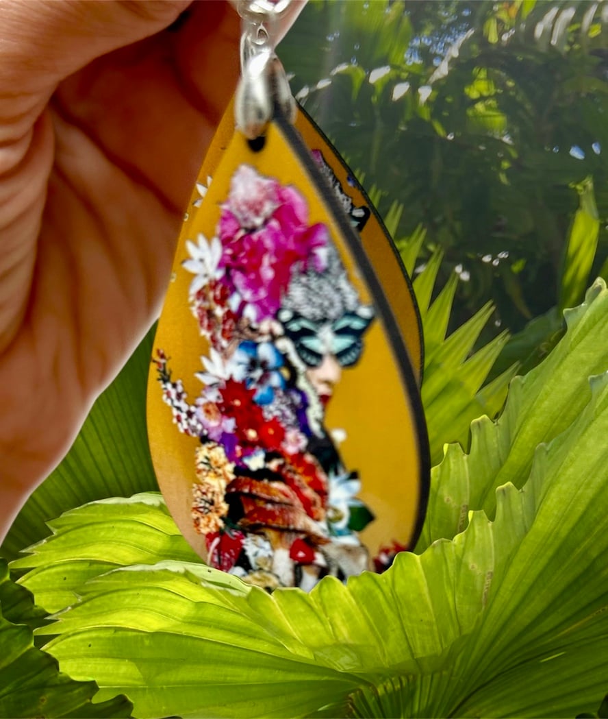 These colorful teardrops feature my original super botanical collage "Witnessing the Transformation of Apatheia" - sublimation printed ON BOTH SIDES of the super lightweight wood material earrings! They are shiny/glossy to boot! Surgical steel for pierced ears, and they will go with ANY outfit! Your earrings will be professionally packaged and sent USPS mail with tracking number and insurance.